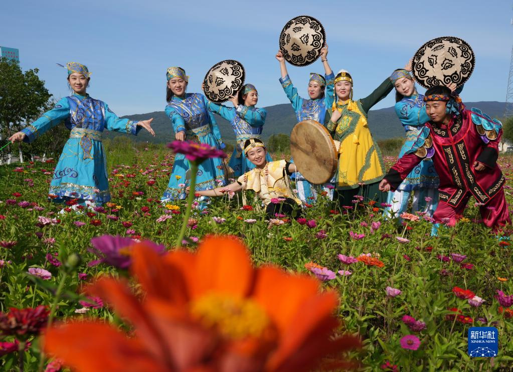 9月4日,在黑龍江撫遠(yuǎn)市烏蘇鎮(zhèn)抓吉赫哲族村,尚美含(右二)和赫哲族青年排練民族舞蹈。