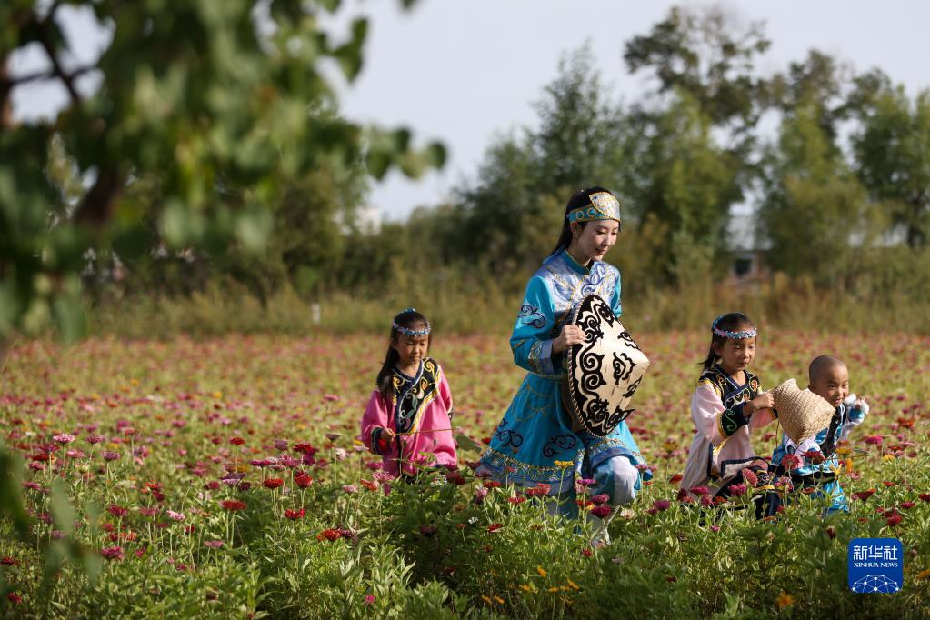 9月4日,在黑龍江撫遠(yuǎn)市烏蘇鎮(zhèn)抓吉赫哲族村,尚美含(左二)領(lǐng)著學(xué)生在花田里玩耍。