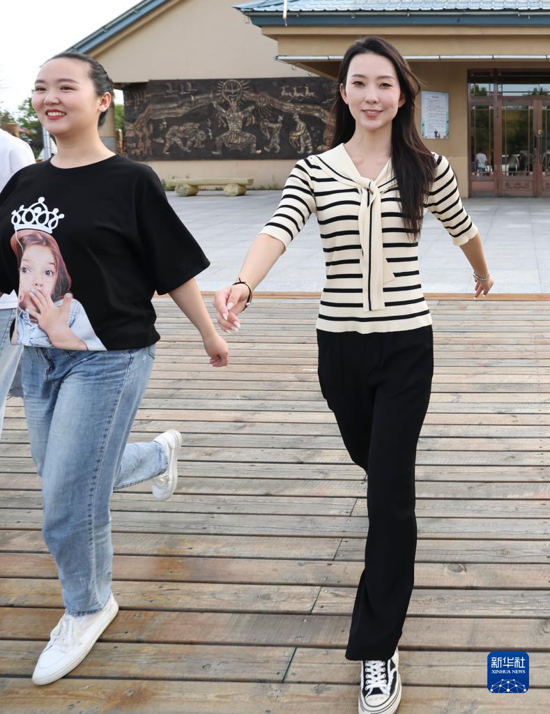 9月4日,在黑龍江撫遠市烏蘇鎮抓吉赫哲族村赫哲民俗展示館前,尚美含(右)在做形體訓練。