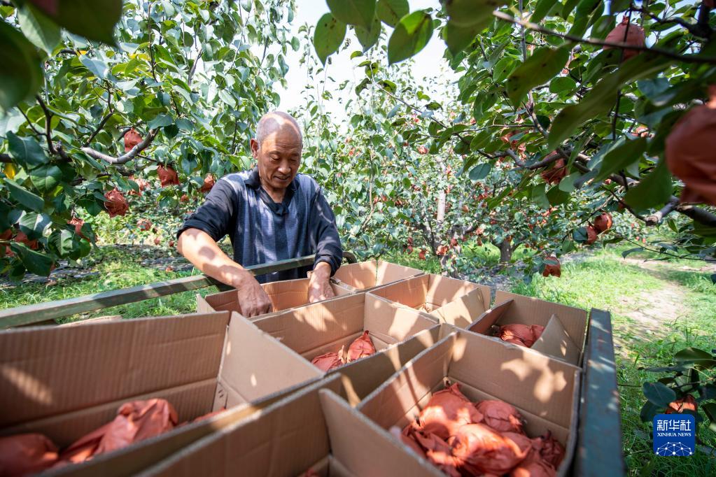 9月14日,村民在修善村的果園里整理剛采摘的梨果。
