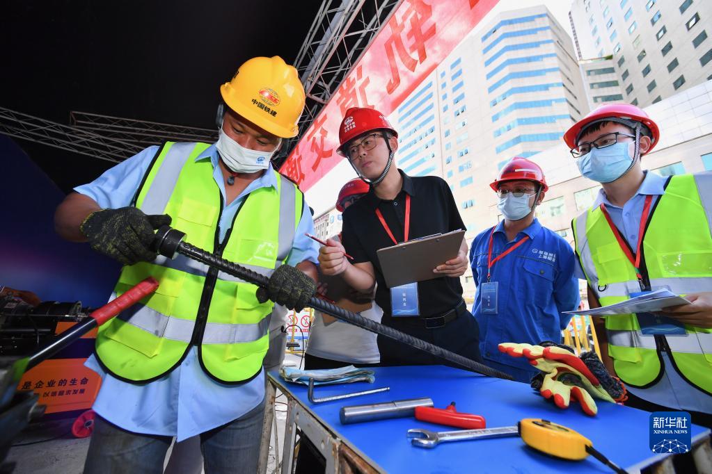 9月14日,參加鋼筋直螺紋套絲項目比賽的參賽選手(左一)向裁判展示加工的成品。