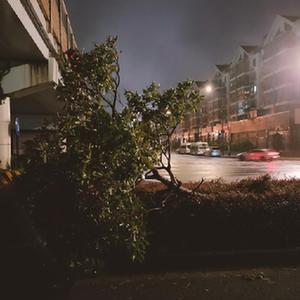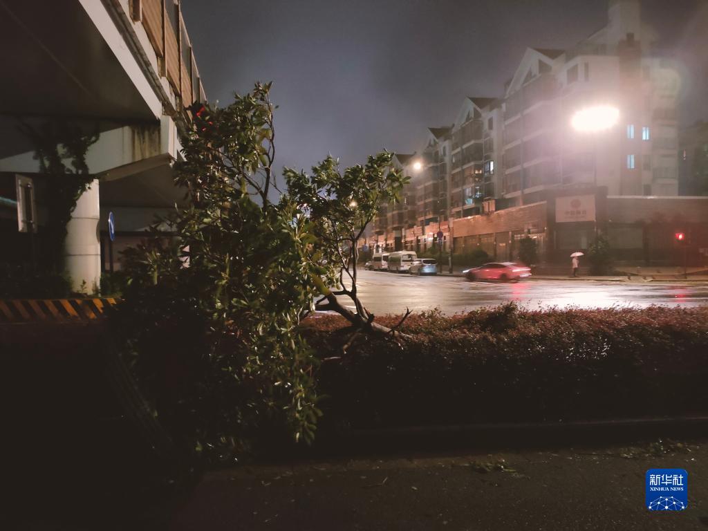 9月14日晚拍攝的浙江省舟山市普陀區(qū)東港海洲路綠化帶上被風吹倒的樹木(手機照片)。