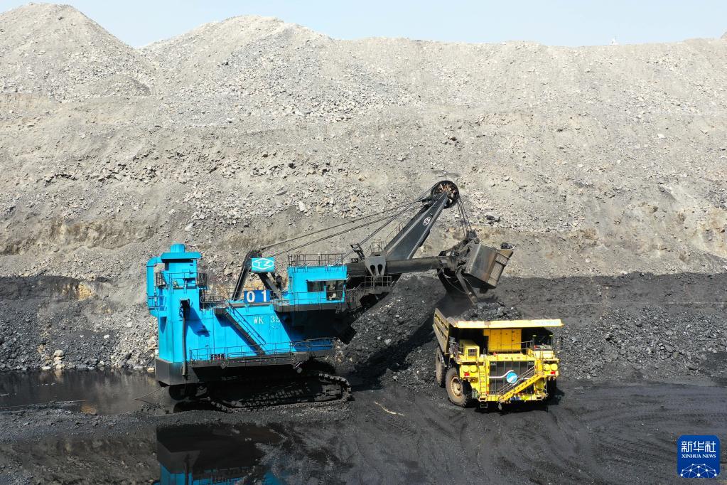 9月14日,在位于準(zhǔn)格爾旗的國家能源集團(tuán)準(zhǔn)能集團(tuán)黑岱溝露天煤礦,電鏟將煤炭裝入重型礦卡(無人機(jī)照片)。