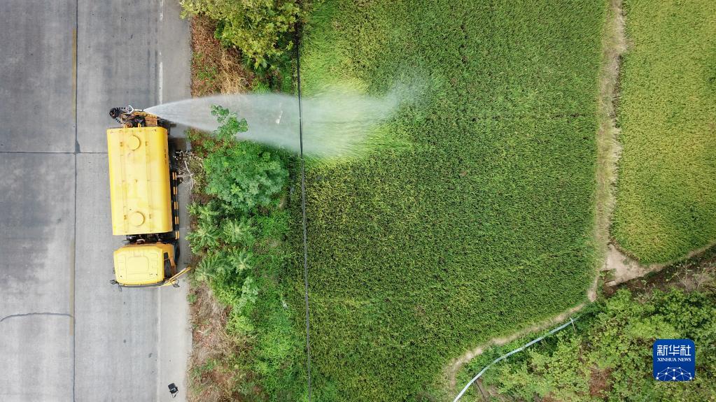 9月15日,在湘潭市雨湖區姜畬鎮聯映村,灑水車在對道路沿線稻田進行灌溉(無人機照片)。