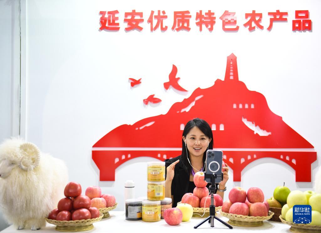 9月15日,在農(nóng)業(yè)科技示范推廣應(yīng)用展館延安展區(qū),主播在介紹特色農(nóng)產(chǎn)品。