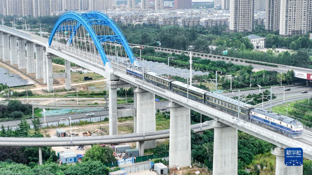 9月15日,檢測列車駛過濟萊高鐵歷城站特大橋(無人機照片)。