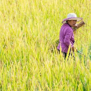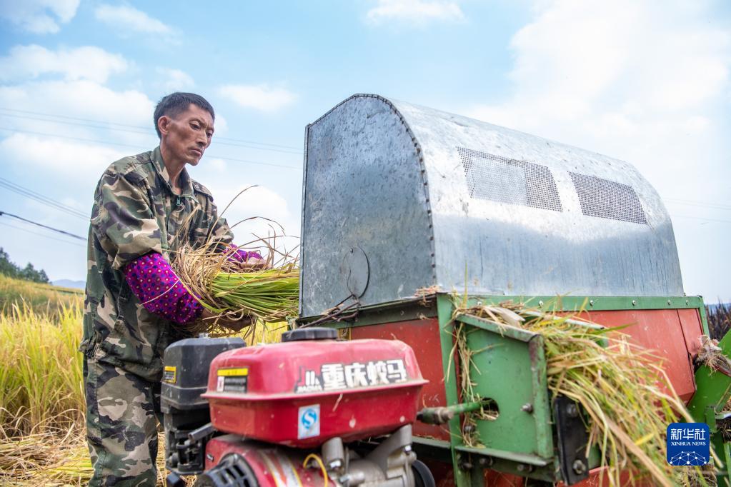 秋收時節,金黃色的水稻鋪滿山坡,稻農們利用晴好天氣搶收稻谷,呈現出一派美麗的豐收畫卷。如今,“花田貢米”已經成為當地人的主要增收來源。