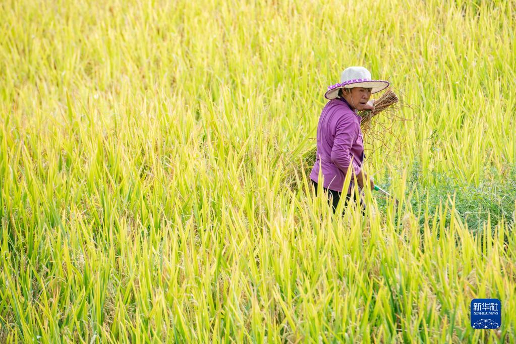 9月14日,在重慶市酉陽土家族苗族自治縣花田鄉,稻農在稻田里搶收稻谷。 新華社記者 唐奕 攝