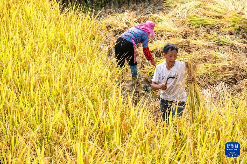9月14日,在重慶市酉陽土家族苗族自治縣花田鄉,稻農在稻田里搶收稻谷。 新華社記者 唐奕 攝