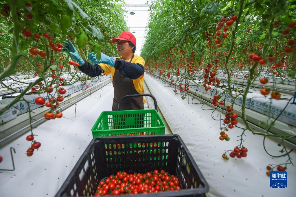 2022年5月31日,在浙江省嘉興市南湖區(qū)七星街道湘家蕩農(nóng)業(yè)數(shù)字化工廠的數(shù)字化大棚內(nèi),農(nóng)民在采摘立體栽培的番茄。新華社記者 徐昱 攝
