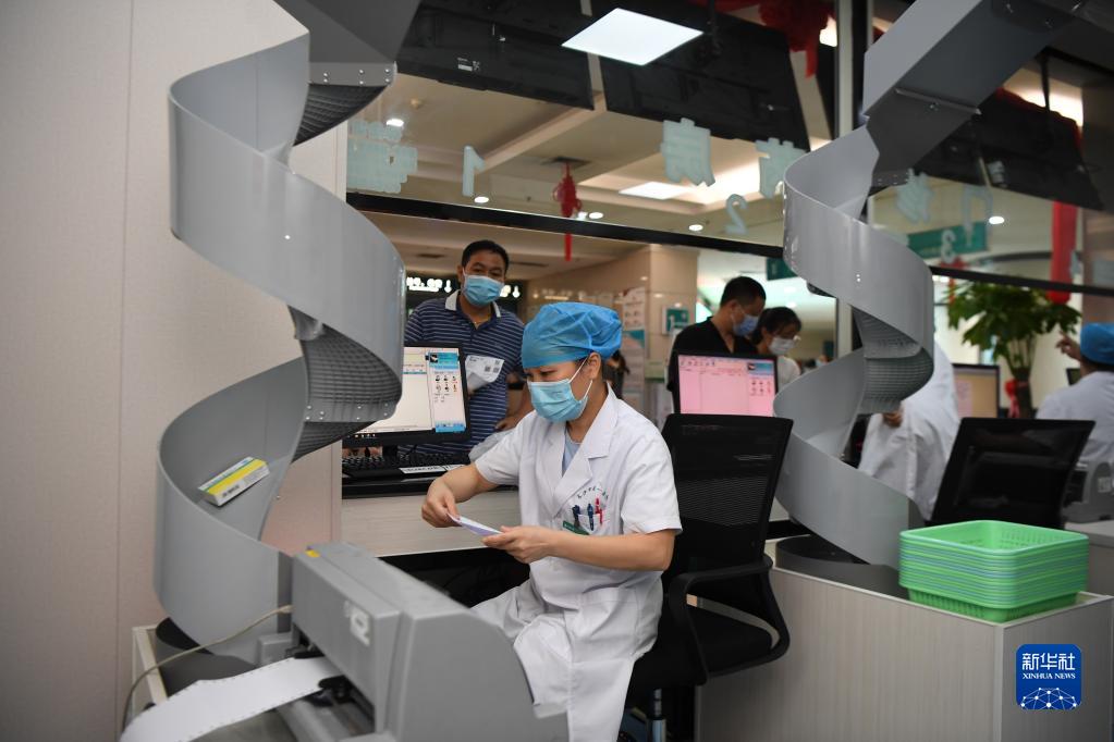 2021年8月11日,醫(yī)務(wù)人員在湖南省長(zhǎng)沙市第一醫(yī)院門(mén)診智慧藥房為患者發(fā)放藥物。新華社記者 薛宇舸 攝