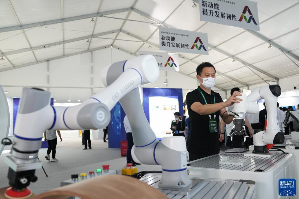 9月15日,在2022年全國大眾創業萬眾創新活動周合肥主會場的主題展區,來自深圳的越疆科技有限公司參展商展示其公司研發的智能協作機械臂。