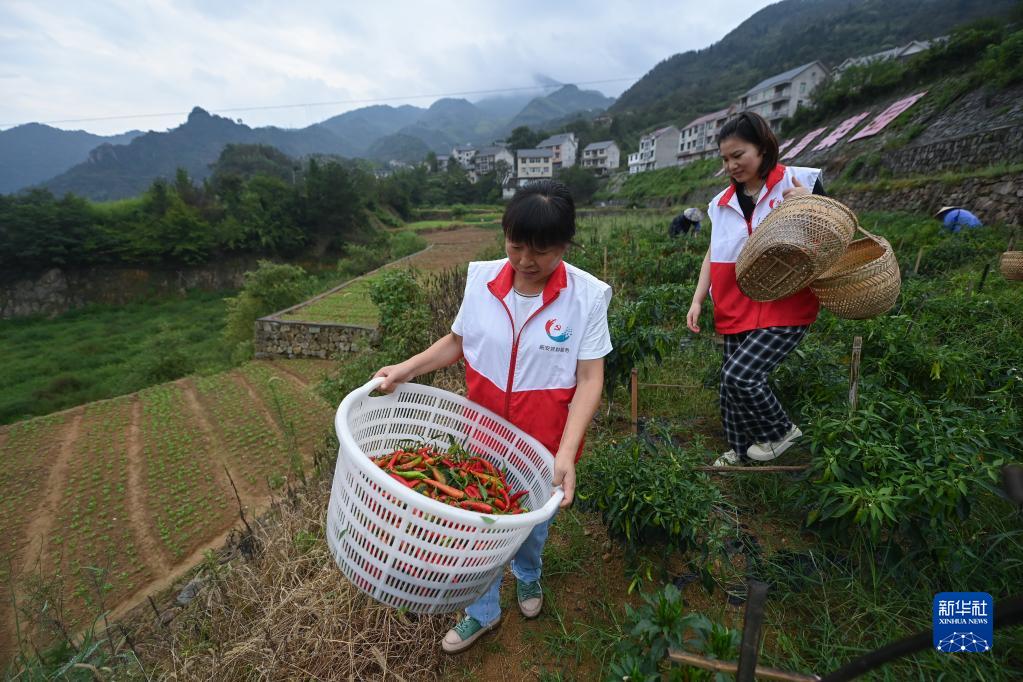 9月16日,在杭州市臨安區龍崗鎮望湖村“共富菜園”,黨員志愿者和村民在搬運采摘的辣椒。