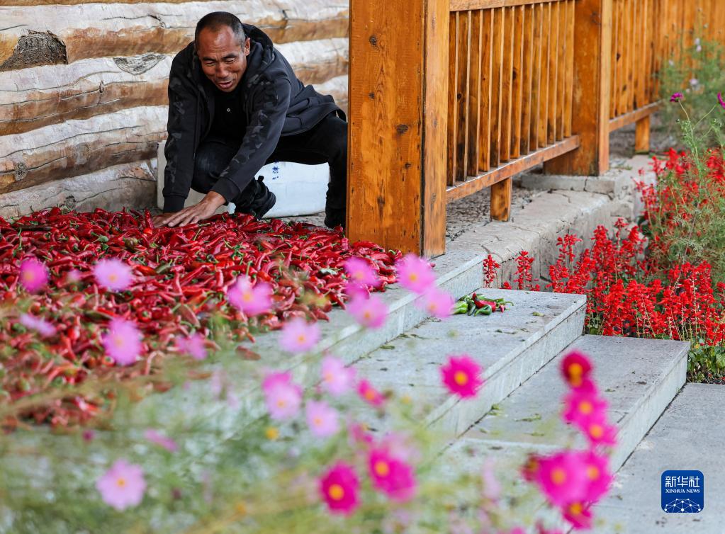 9月1日,在富錦國家濕地公園食堂前,李長吉在晾曬辣椒。