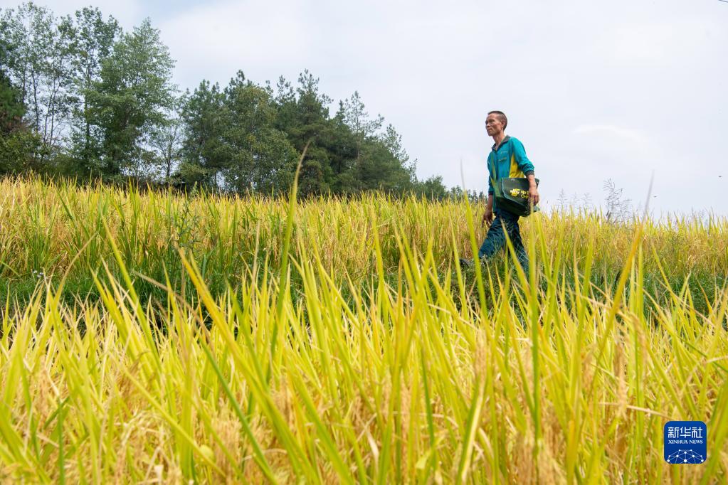 9月15日,投遞員張永洪行走在武陵山間的稻田田坎上。