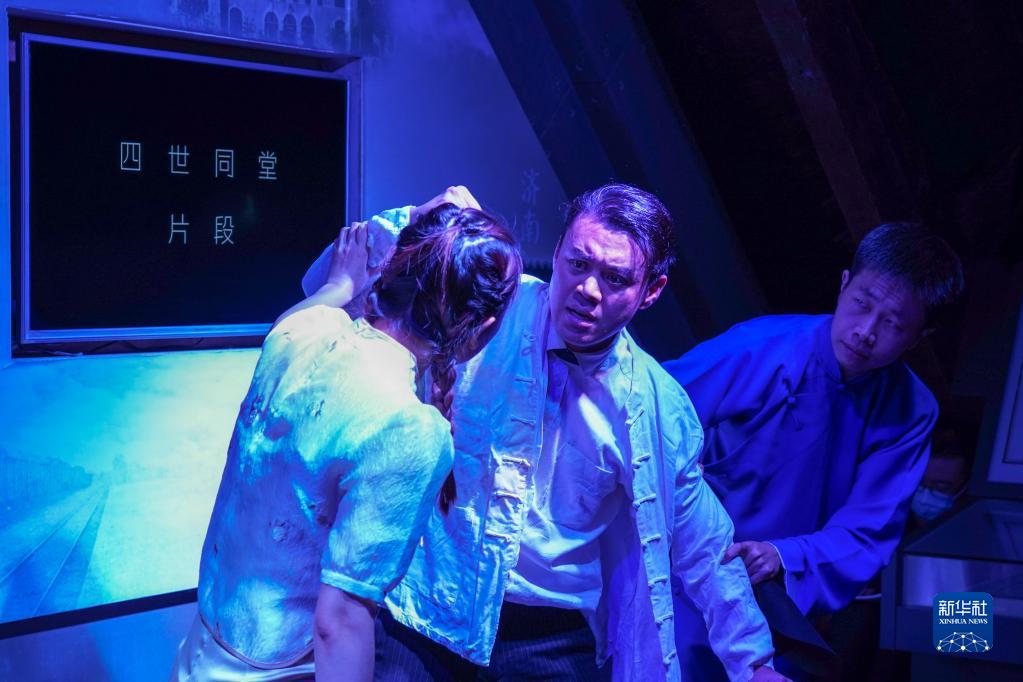 9月16日,演員在膠濟鐵路博物館內表演《四世同堂》片段。