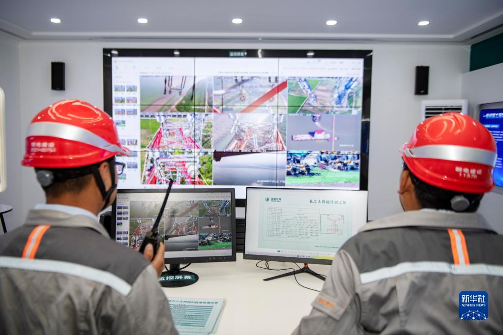 9月16日,安徽送變電工程有限公司施工人員在工地智慧監(jiān)控中心指揮跨江作業(yè)。