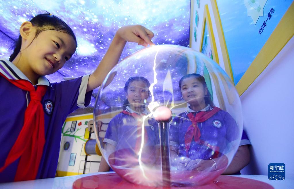 9月16日,河北省邯鄲市叢臺區(qū)叢陽小學(xué)的學(xué)生在校園科技館體驗(yàn)“輝光球”。