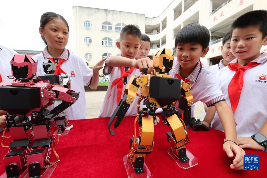 9月16日,浙江省湖州市德清縣三橋小學學生與智能機器人互動。