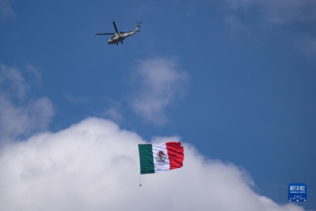 9月16日,在墨西哥首都墨西哥城,直升機(jī)在獨(dú)立日閱兵式上展示墨西哥國旗。