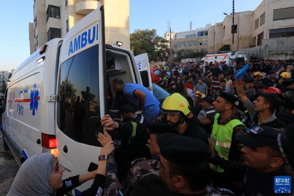 9月13日,在約旦首都安曼的居民樓倒塌事故現場,救援人員將傷者轉移到救護車上。