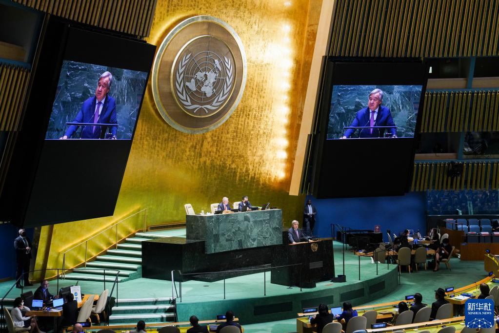 9月13日,在位于紐約的聯合國總部,聯合國秘書長古特雷斯在第77屆聯合國大會第一次全會上致辭。