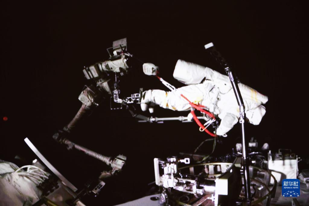 9月17日在北京航天飛行控制中心拍攝的神舟十四號(hào)航天員蔡旭哲在艙外操作的畫(huà)面。