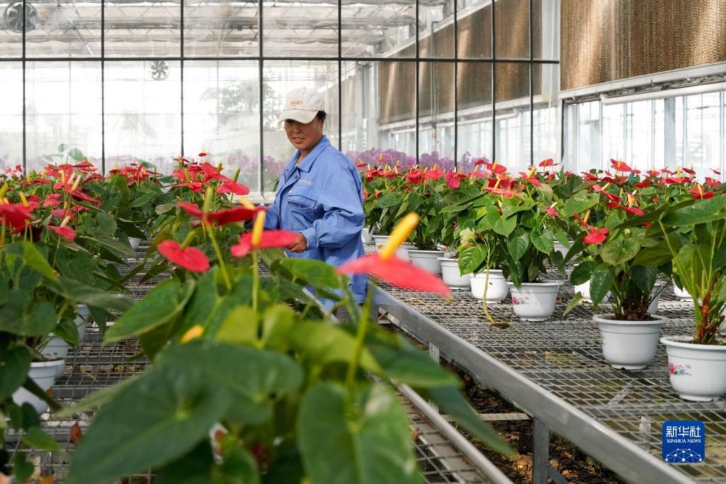 農民在興十四村現代農業示范園區大棚溫室中管理花卉作物(9月16日攝)。