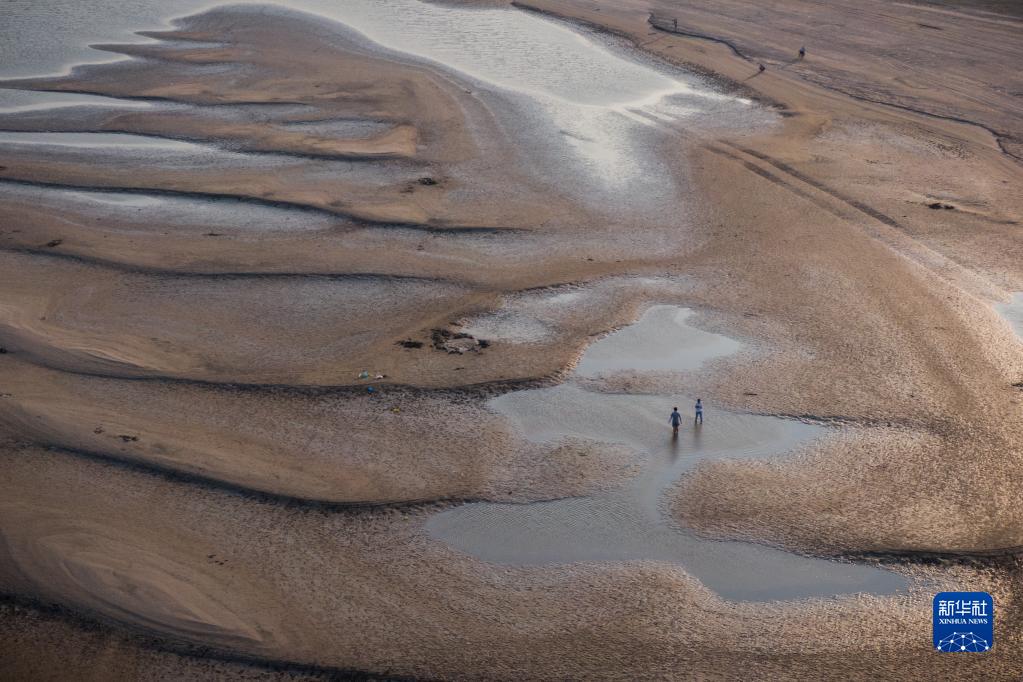 市民在漢口江岸灘涂上游玩(9月13日攝,無人機照片)。因長江武漢段水位持續消退,大片灘涂露出江面,天興洲北岸幾乎與漢口江岸連成一片。