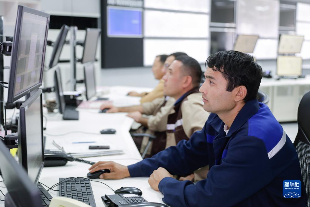 8月18日,在烏茲別克斯坦納沃伊市的納沃伊氮肥股份公司,烏方工作人員監控聚氯乙烯生產。