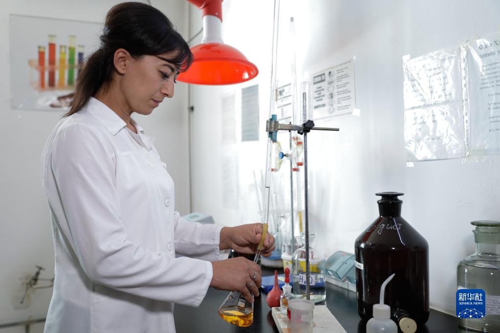8月18日,在烏茲別克斯坦納沃伊市的納沃伊氮肥股份公司,烏方工作人員進行產品檢測。