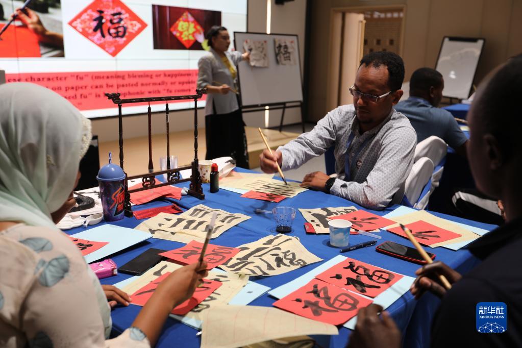 當日,在吉布提非洲青年創新創業中心,吉布提孔子學院老師為來自吉布提、埃賽俄比亞、肯尼亞、烏干達的非洲創業青年上了一堂生動的中國文化課。風俗、書法、剪紙等中國文化引起了學員們的廣泛興趣。