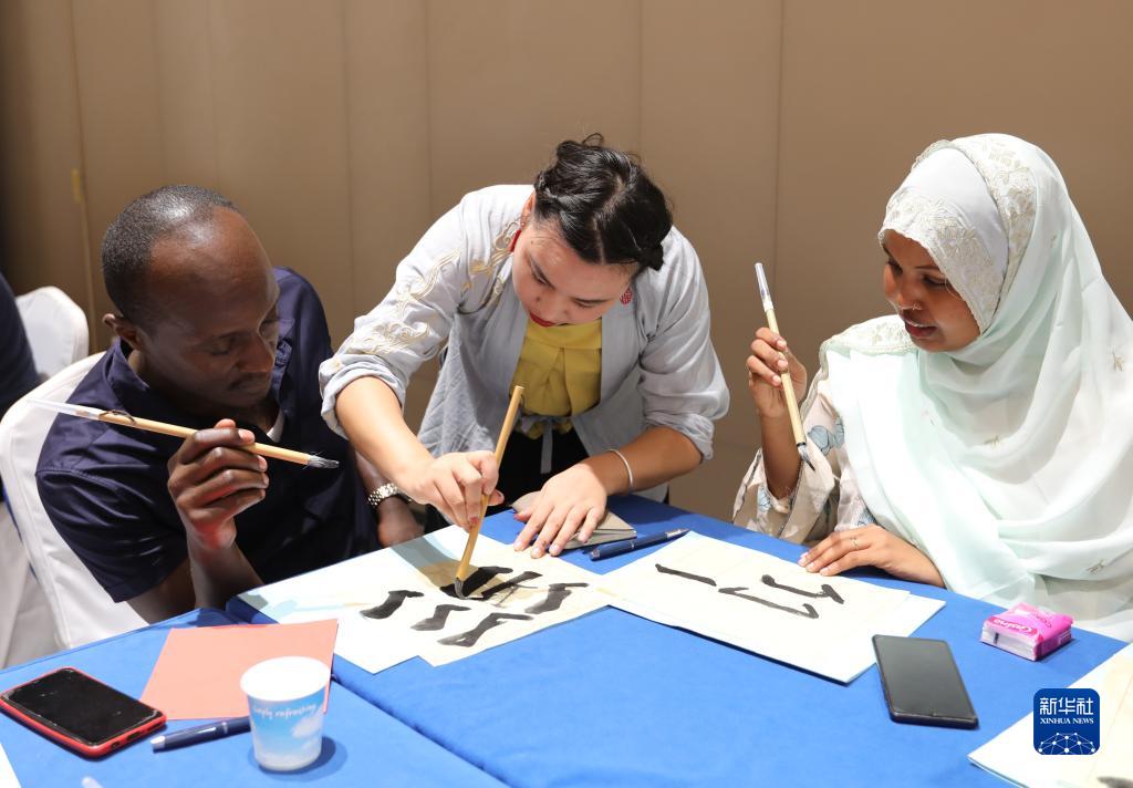 9月18日,在吉布提首都吉布提市,吉布提孔子學院老師教學員寫毛筆字。