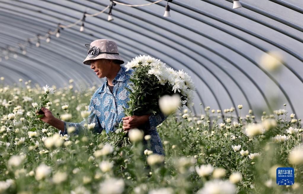 9月17日,山東省棗莊市光明路街道十里泉村農民在大棚里采收菊花。