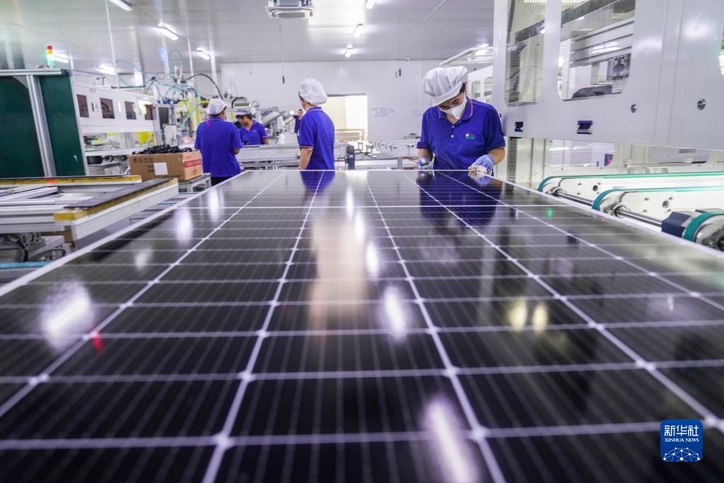 9月17日,山東省東營(yíng)經(jīng)濟(jì)技術(shù)開發(fā)區(qū)潤(rùn)馬光能科技有限公司工人在生產(chǎn)太陽能電池板。
