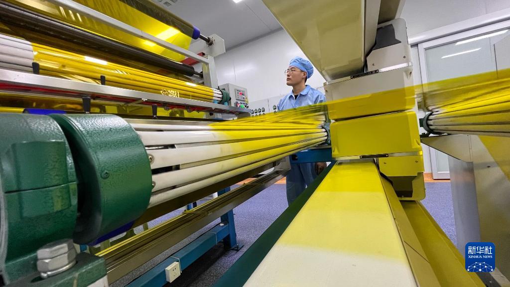 9月17日,在東營經(jīng)濟(jì)技術(shù)開發(fā)區(qū)欣邦電子科技有限公司聚酰亞胺薄膜生產(chǎn)車間,工人操作拉伸機(jī)對薄膜進(jìn)行拉伸。