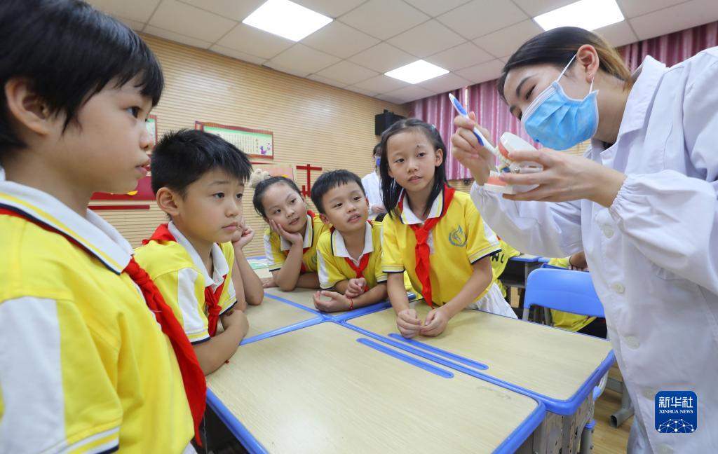 9月19日,在湖南省衡陽市雁峰區(qū)環(huán)城南路小學,南華大學衡陽醫(yī)學院口腔專業(yè)的大學生志愿者在指導孩子們用正確的方式刷牙。