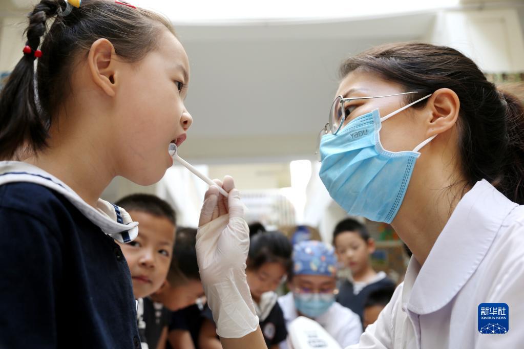 9月19日,在江蘇省連云港市核電鐘聲國際幼兒園,醫務人員給小朋友們檢查牙齒健康狀況。