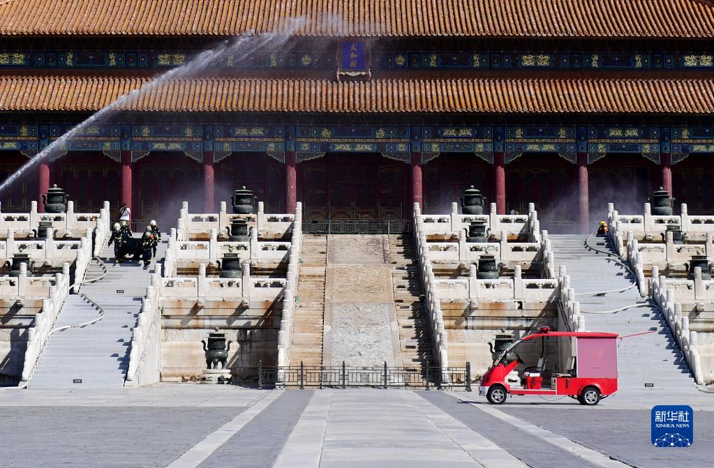 9月19日在故宮太和殿前拍攝的文物古建筑消防救援綜合實戰演練現場。