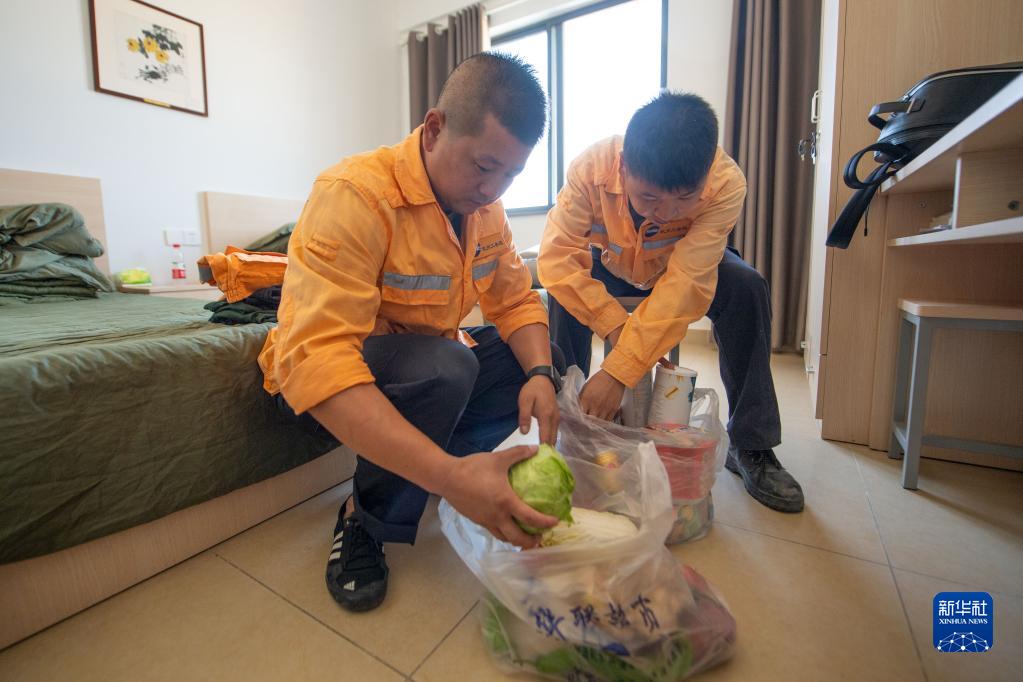 9月19日,看守員趙偉燈(左)與蔡金礦在寢室內準備值守期間的各類生活物資。