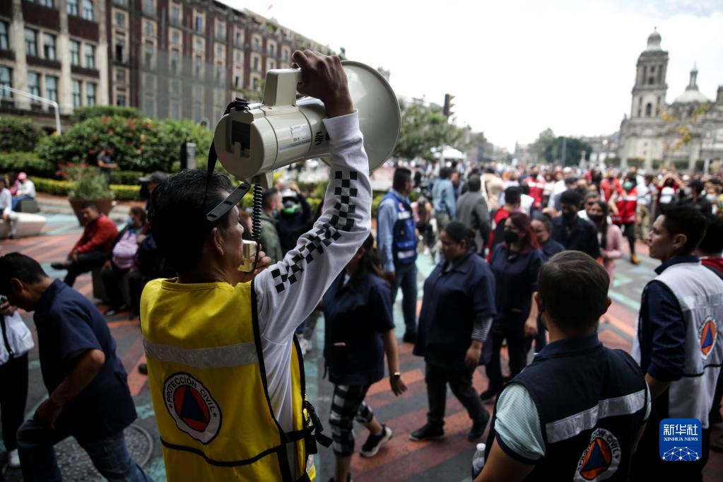 9月19日,在墨西哥首都墨西哥城,民防人員引導(dǎo)室外避險(xiǎn)的民眾。