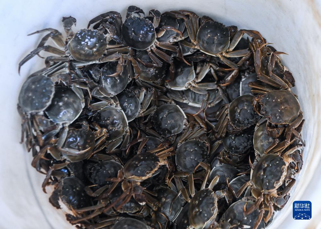 織里鎮喬溇村的溇港人家太湖蟹生態養殖基地內剛剛捕撈的太湖蟹(9月20日攝)。