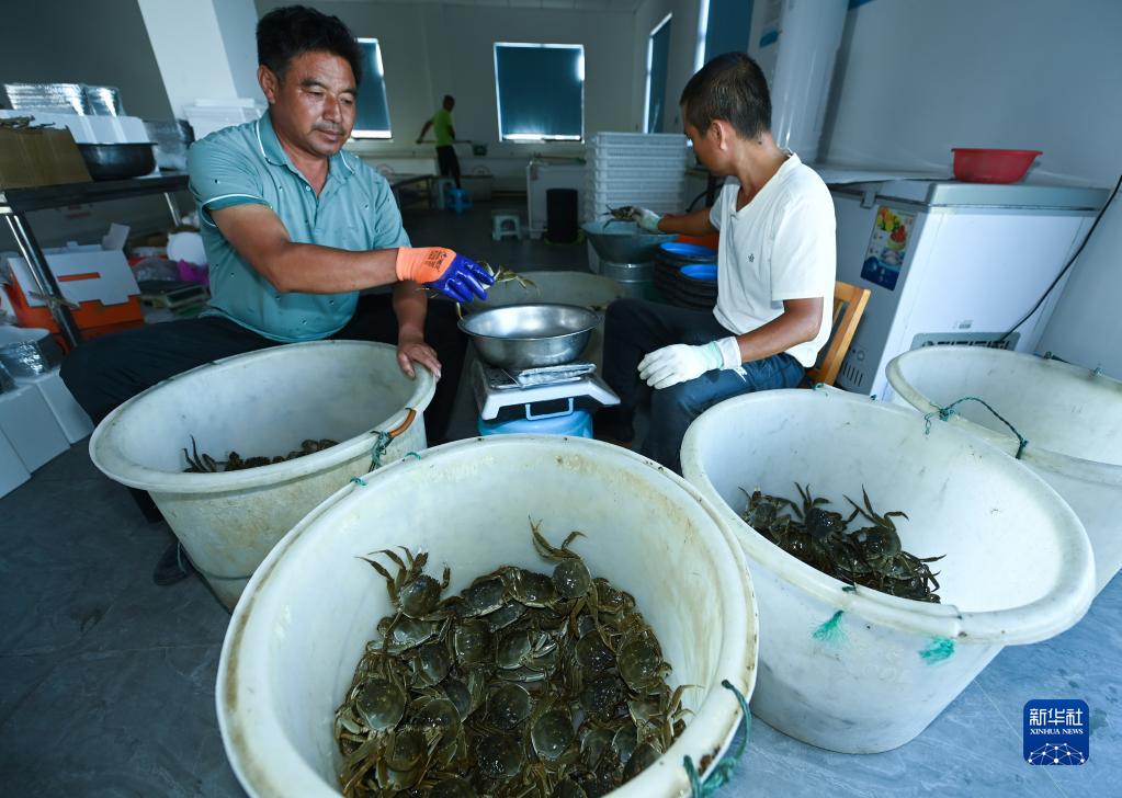 9月20日,在位于織里鎮喬溇村的溇港人家太湖蟹生態養殖基地內,蟹農們在給捕撈上來的太湖蟹稱重分類。