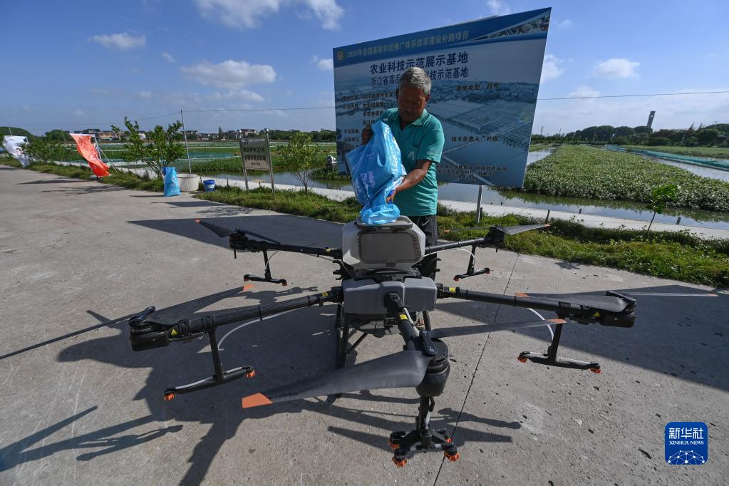9月20日,在位于織里鎮(zhèn)喬溇村的溇港人家太湖蟹生態(tài)養(yǎng)殖基地內(nèi),蟹農(nóng)在給無人機(jī)裝飼料,準(zhǔn)備用無人機(jī)給螃蟹喂食。