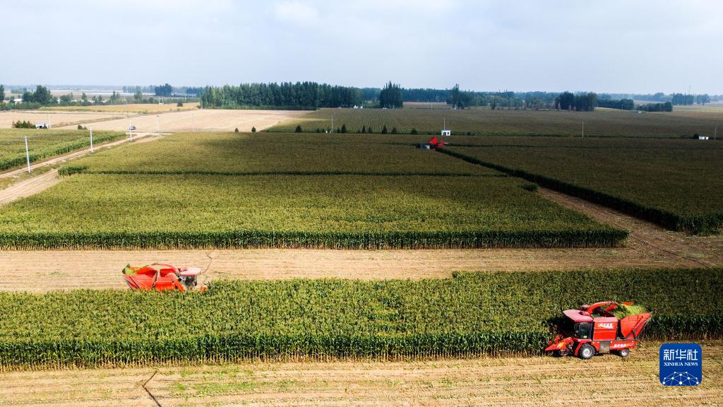 9月20日,農民駕駛收割機行駛在準格爾旗十二連城鄉康布爾村的玉米地里(無人機照片)。
