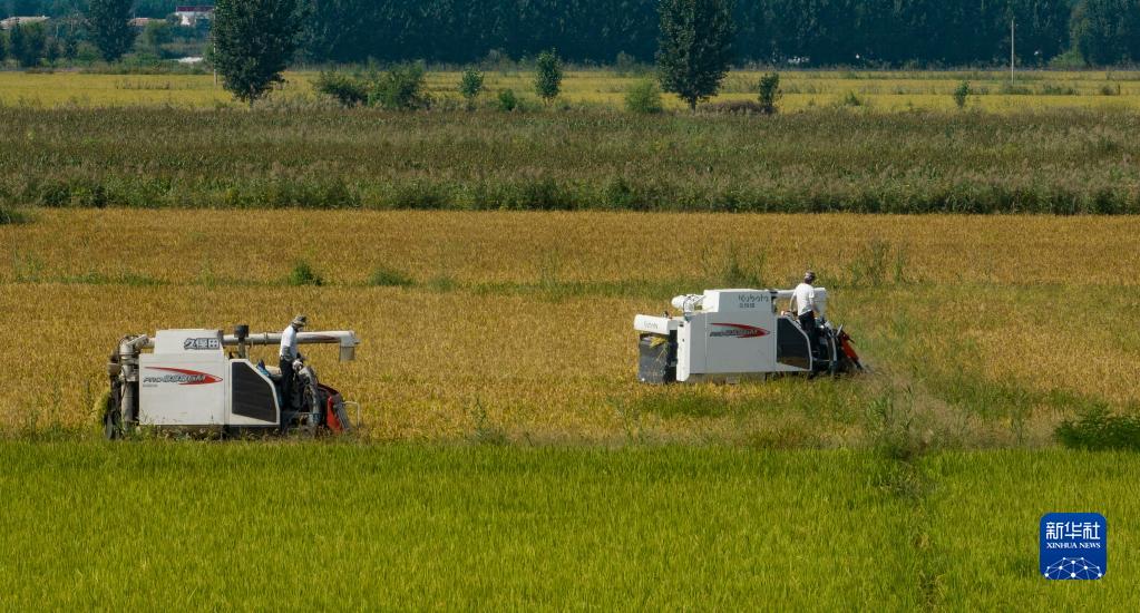 9月16日,河北唐山蘆臺經濟開發區海北鎮大海北村農民利用收割機收獲水稻(無人機照片)。