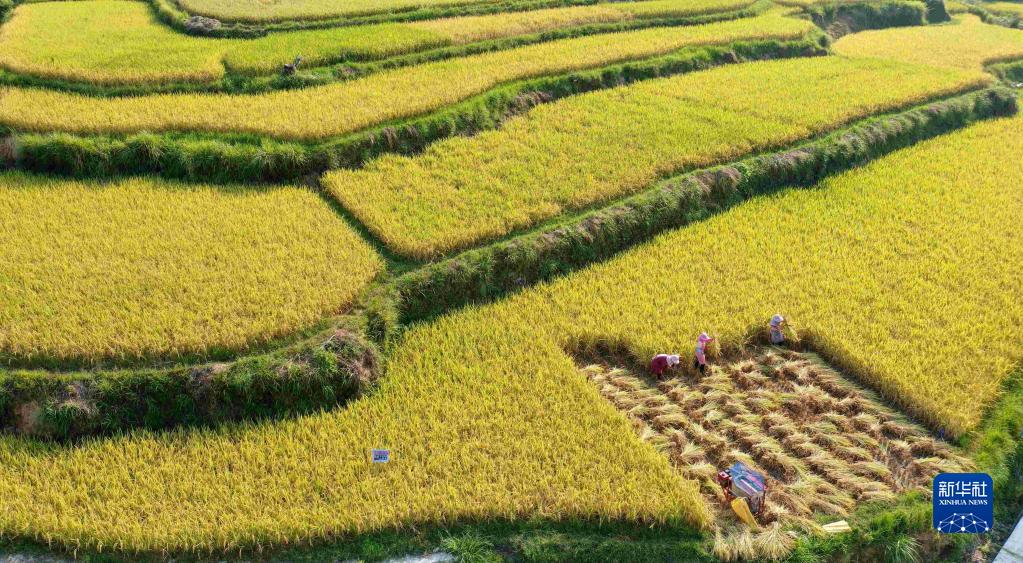 9月9日,農(nóng)民在貴州省黔東南苗族侗族自治州榕江縣忠誠鎮(zhèn)盤踅村的梯田上收割稻谷(無人機照片)。