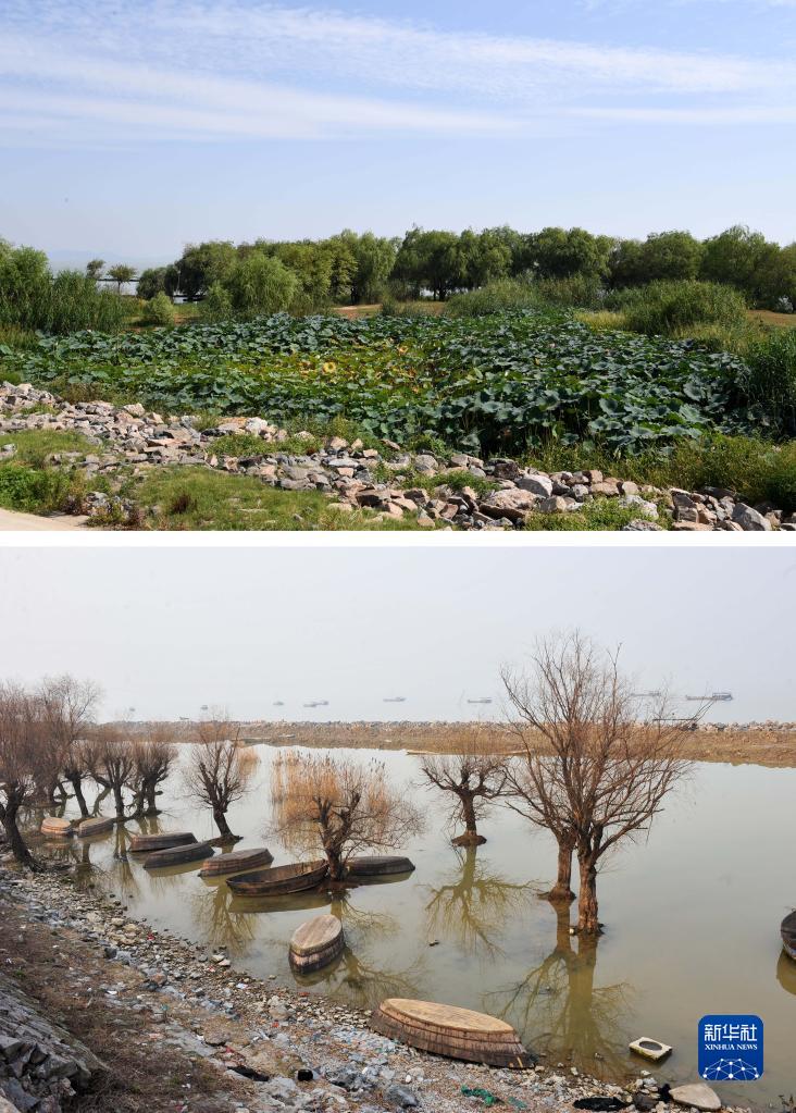 這是一張拼版照片:上圖為2022年9月6日拍攝的巢湖岸邊的濕地(新華社記者劉軍喜攝);下圖為2012年2月17日拍攝的巢湖岸邊的樹木(何希斌攝)。