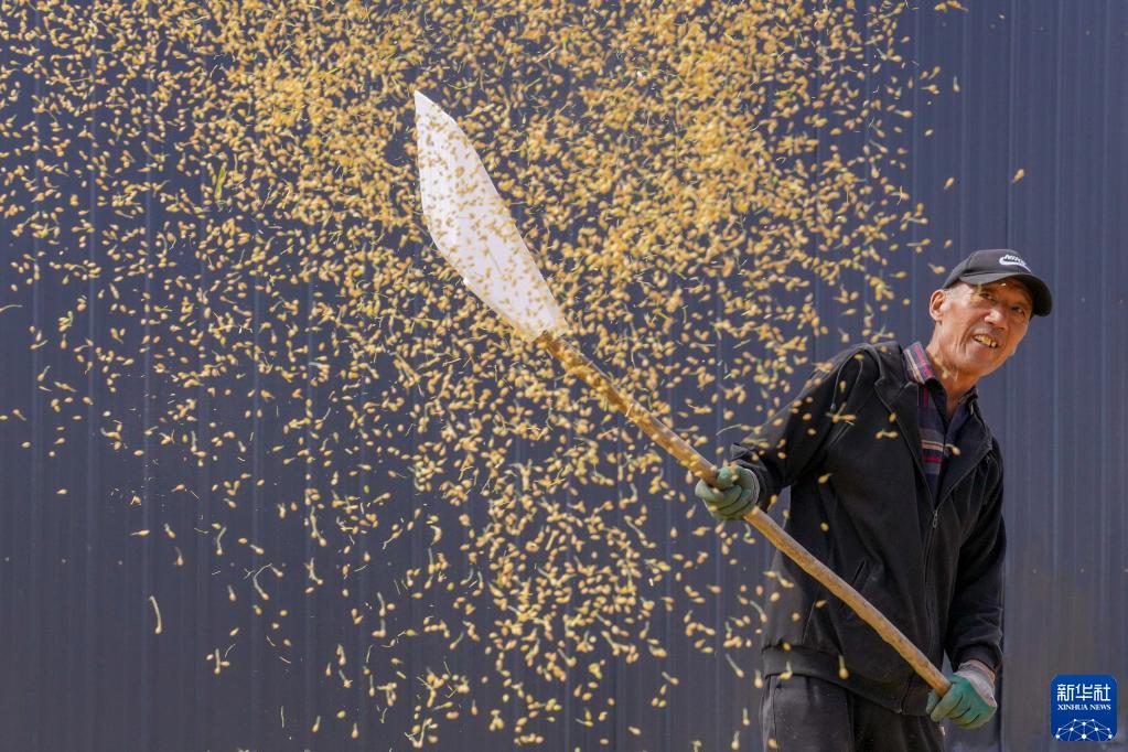 9月20日,在吉林省長春市九臺區龍嘉農樂種植家庭農場,一位農民在揚稻谷。