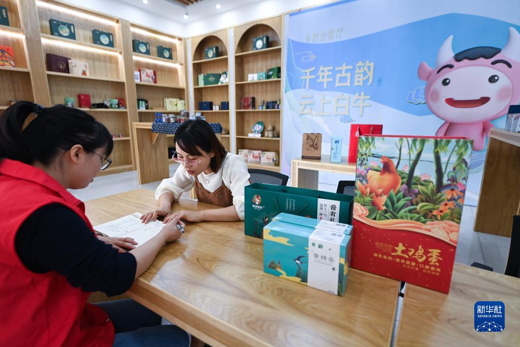 9月21日,在杭州市臨安區昌化鎮白牛村電商大樓的農創客中心,張青(右)與昌化鎮黨員志愿者討論直播培訓計劃。張青回鄉聯合當地青年志愿者組建“云上白牛·同心薈”特色電商平臺,組織“農創客”開展直播培訓。